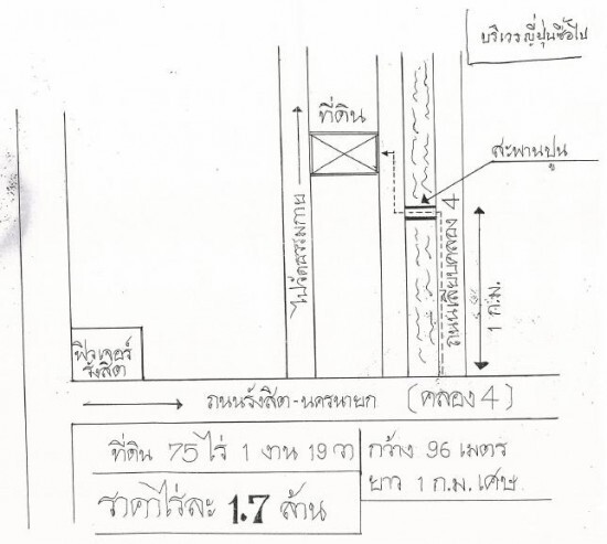 ขายที่ดินเปล่ารังสิตคลอง 4 ฝั่งตรงข้าม dreamworld อยู่ถนนเลียบคลอง 4 จำนวน 75 ไร่ ราคาไร่ละ 1.7 ล้านบาท