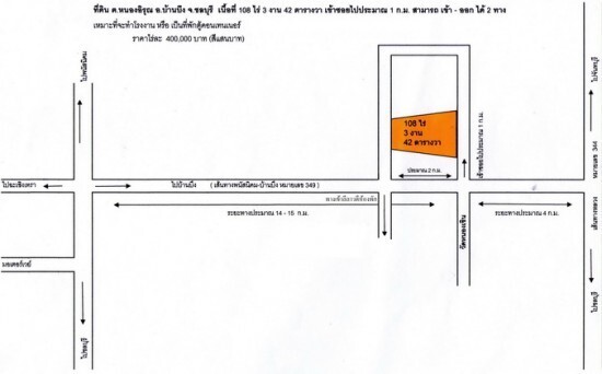 ต้องการขายที่ดิน 108 ไร่ 3 งาน 42 ตารางวา ต.หนองอิรุณ อ.บ้านบึง จ.ชลบุรี ห่างจากถนนสาย 349 (พนัสนิคม-บ้านบึง) ประมาณ 1 กม. ราคาไร่ละ 400,000.- บาท (สี่แสนบาทถ้วน)