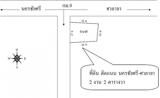 2 งาน 2 ตารางวา ด้านติดถนนกว้าง 27 ม. ลึก 38 ม. ด้านหลังกว้าง 20 ม.