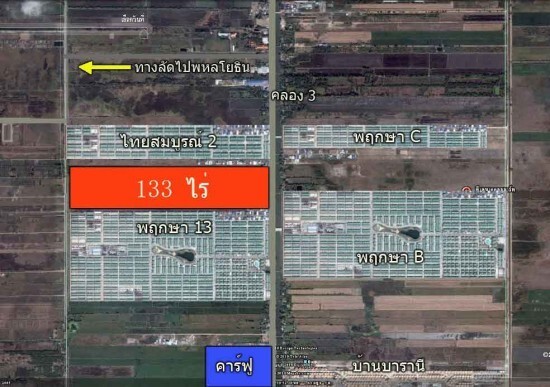ที่ดิน133ไร่ ย่านรังสิต คลองสาม หน้ากว้าง ประมาณ 130 เมตรติดถนนลาดยาง เลียบคลองสาม แวดล้อมไปด้วยหมู่บ้านจัดสรรและแหล่งสาธารณูปโภคมากมาย จากห้างคาร์ฟูเพียง 1 กม.เท่านั้น มีรถเมย์ผ่าน 3สาย ไกล้ รพธรรมศาสตร์ ตลาดไทย วัดพระธรรมกาย เพียง 2-6 กมเท่านั้น