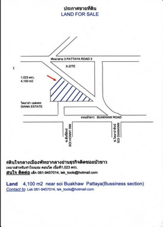 เนื้อที่ 1023 ตรว. 120,000/ตรว.Land 4100 m2 near soi Buakhaw Pattaya(Bussiness section)