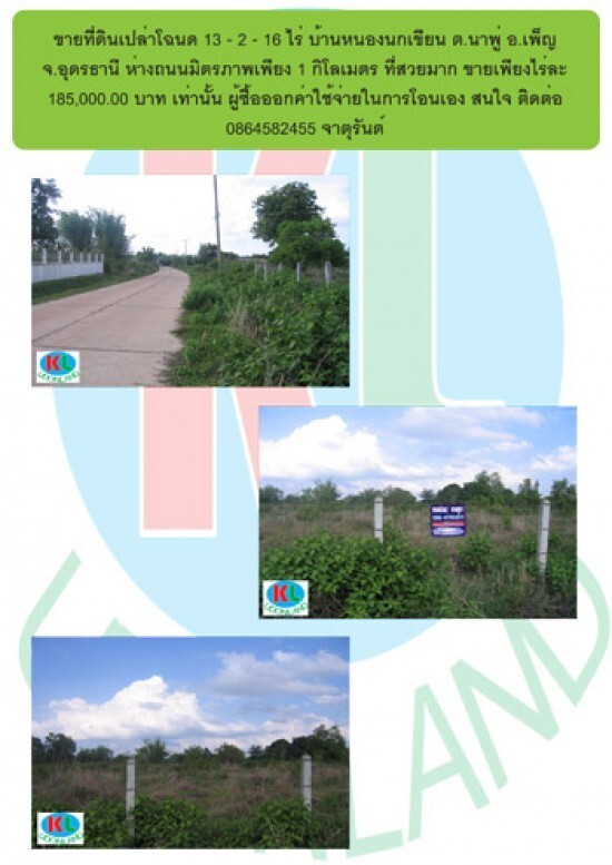 ขายที่ดินเปล่าโฉนด 13 - 2 - 16 ไร่ บ้านหนองนกเขียน ต.นาพู่ อ.เพ็ญ จ.อุดรธานี อยู่ห่างถนนมิตรภาพเพียง 1 กิโลเมตร ที่สวยมาก ขายเพียงไร่ละ 185,000.00 บาท ผู้ซื้อออกค่าใช้จ่ายในการโอนเอง
