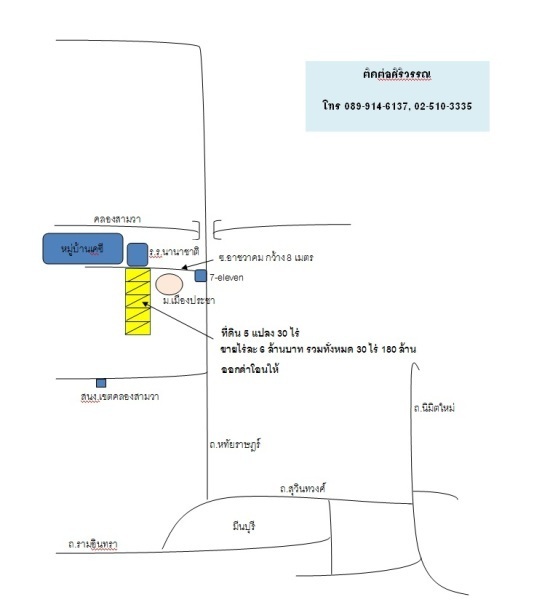 ขายที่ดินหทัยราษฎร์ มีนบุรี 30 ไร่ ไร่ละ 6 ล้านบาท ที่ดินติดถนน คมนาคมสะดวก เหมาะแก่การลงทุนหรือทำหมู่บ้านจัดสรร