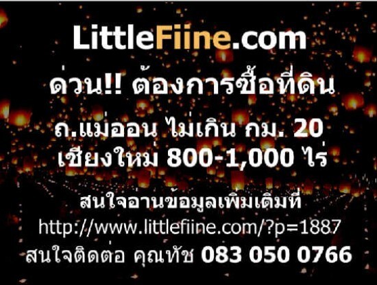 ต้องการซื้อที่ดิน ถนนสายแม่ออน ไม่เกิน กม. 20 เชียงใหม่ หน้ากว้าง 1 กิโลเมตรขึ้นไป 800-1000 ไร่ การเกษตร ไม่เกิน 5 แสนไร่