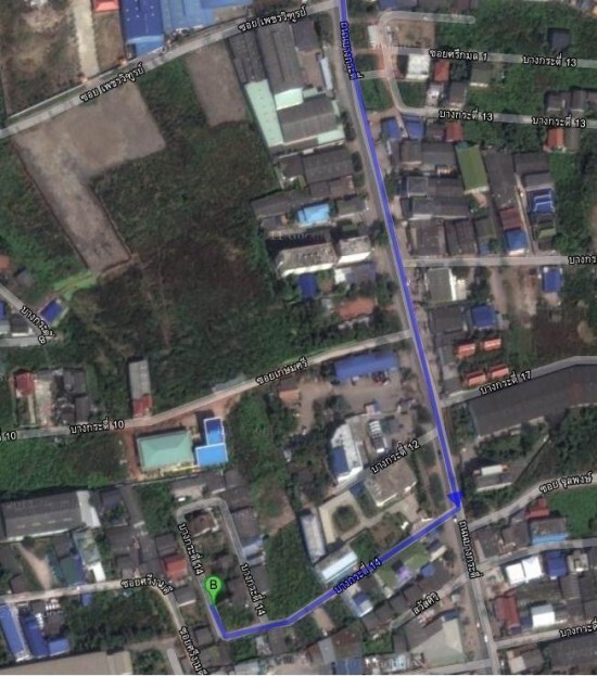 จากรูป ที่แปลงที่จะขายคือตำแหน่ง B ครับ เข้ามาจากถนนพระราม2 (เส้นสีน้ำเงิน วิ่งมาจากดาวคะนอง)