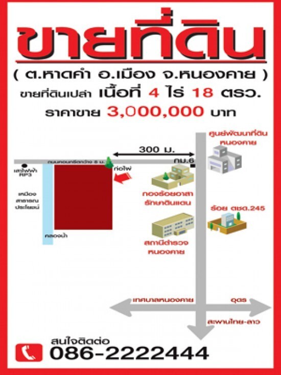 ขายที่ดินเปล่า เนื้อที่ 4 ไร่ 18 ต ร ว . ตรงข้าม สถานีพัฒนาที่ดินหนองคาย เข้าไป 300 ม.