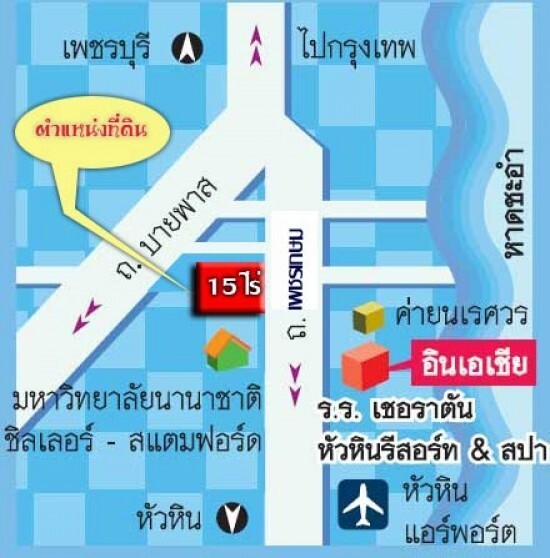ายที่ดิน 15 ไร่ไกล้สนามบินหัวหิน หน้ากว้างติดถนนเพชรเกษมเกือบ 300 เมตรด้านหลังติดทางรถไฟไกล้แหล่งสาธารณูปโภคมากมายแหละแหล่งท่องเที่ยวมาก มาย เหมาะสร้างคอนโด โรงแรม หรือห้างร้าน โครงการจัดสรรฯลฯ ขายไร่ละ 6.9 ล้าน(ราคาเจ้าของขายเอง)สนใจติดต่อ แจ๊ค 0827943497 แผนที่ http://www.ddproperty.com/property/show/190907