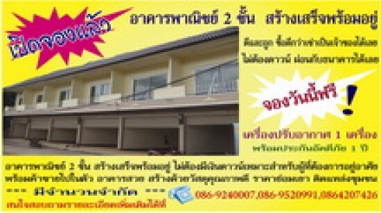 รายละเอียด อาคารพาณิชย์สร้างใหม่สวยมากทั้งหมด 6 หลัง ขณะนี้เหลือหลังสุดท้ายแล้ว เจ้าของอยากขายตัดราคาเป็นราคาสุดท้าย 920,000 บาท เหมาะสำหรับอยู่อาศัยพร้อมค้าขาย หรือให้เช่าก็ได้ สามารถนำอาคารพาณิชย์นี้ไปจดจำนองแล้วกู้เงินจากแบงค์ได้เต็มจำนวนราคาขาย โดยไม่ต้องใช้คนค้ำประกัน จอง 10,000 บาท แล้วทำสัญญาจะซื้อจะขายเพื่อนำไปยื่นกู้ได้เลย กู้ไม่ผ่านยินดีคืนเงินให้ มีมิเตอร์น้ำ มิเตอร์ไฟ สมุดจดทะเบียนบ้าน เคาเตอร์ครัว ห้องนอนติดไฟดาวน์ไลท์ ระเบียงสแตนเลส เข้าอยู่ได้เลย เจ้าของอยากขาย มีอยู่หลังเดียวแล้ว อยู่พร้อมทำธุรกิจได้เลยตึกติดกันเป็นร้านเกมส์ มาก่อนได้ก่อน ราคาสุดท้าย หอพักบริเวณใกล้เคียงราคา 1,600,000-1,900,000 บาทครับ สนใจสอบถามรายละเอียดครับ 0869240007