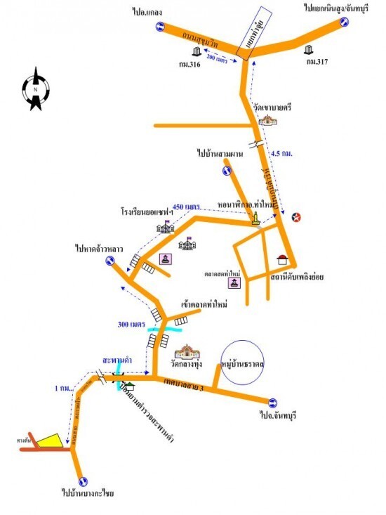 1,600 เมตร จากหอนาฬิกา ตลาดสด อ.ท่าใหม่ ข้ามสะพานท่าใหม่ ตรงไปตามถนน ชบ.6001(สายท่าใหม่-บางกระไชย)ประมาณ 1,300 ม เลี้ยวขวาเข้าซอย 330 ม ทางสาธารณะประโยชน์