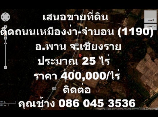 เสนอขายที่ดิน ติดถนนเหมืองง่า-จำบอนต.สันติสุข อ.พานจ.เชียงราย ประมาณ 25 ไร่ ราคา 400,000 บาทต่อไร่