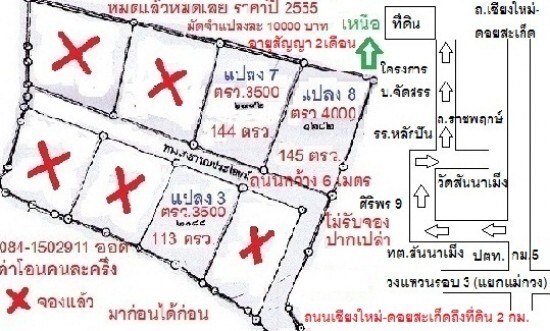 ขายที่ดิน1งานกว่า 3 แปลงสุดท้าย ตรว.ละ3500 (2แปลง),ตรว.ละ4000(1แปลง) เขตเทศบาลสันนาเม็ง สันทราย เชียงใหม่ ทางสาธารณะกว้าง 6 เมตร 0841502911(ออด) ค่าโอนคนละครึ่ง มัดจำแปลงละ 10000 บาท มาก่อนได้ก่อน หมดแล้วหมดเลย ไม่รับจองปากเปล่า