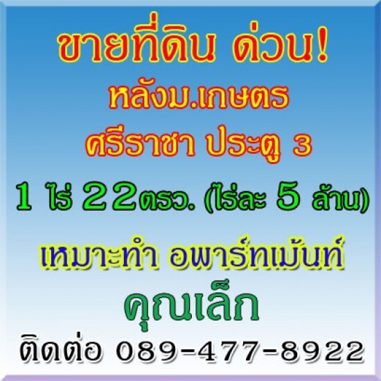 ไร่ละ 5 ล้าน อยู่หลังประตู 3 ม.เกษตร ศรีราชา