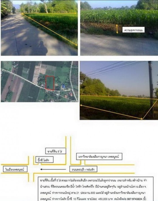 ขายที่ดิน เนื้อที่ 5 ไร่ สวยมากไม่ต้องถมดินอีก เพราะถมไว้แล้วสูงกว่าถนน เหมาะสำหรับ สร้างบ้าน ทำบ้านส่วน ที่ติดถนนคอนกรีต มีน้ำ ไฟฟ้า โทรศัพท์ถึง มีบ้านคนอยู่ติดๆกัน อยู่ตำบลบ้านโตก อ.เมือง จ.เพชรบูรณ์ ห่างจากถนนใหญ่ สาย 21 ประมาณ 800 เมตรได้ อยู่ด้านหลังมหาวิทยาลัยเฉลิมกาญจนา เพชรบูรณ์ ห่างจากโลตัท บิ๊กซี 10 กิโลเมตร ขายไร่ละ 450,000 บาท สนใจติดต่อ 087-9743824 (บี้)