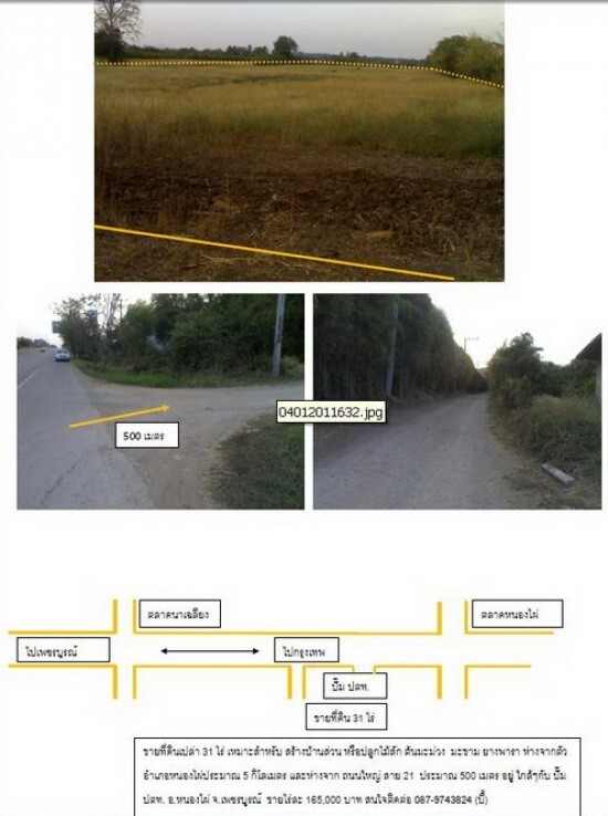 ขายที่ดินเปล่า 31 ไร่ (โฉนด)เหมาะสำหรับ สร้างบ้านส่วน หรือปลูกไม้สัก ต้นมะม่วง มะขาม ยางพารา ห่างจากตัวอำเภอหนองไผ่ประมาณ 5 กิโลเมตร และห่างจาก ถนนใหญ่ สาย 21 ประมาณ 500 เมตร อยู่ ใกล้ๆกับ ปั๊ม ปตท. อ.หนองไผ่ จ.เพชรบูรณ์ ขายไร่ละ 125,000 บาท สนใจติดต่อ 087-9743824 (บี้)