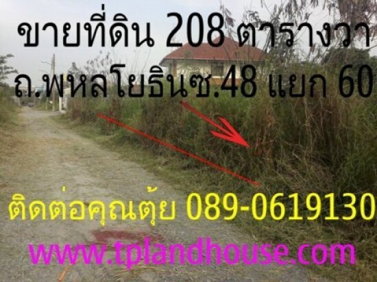 ขายที่ดิน 208 ตรว.ถ.พหลโยธิน 48 แยก 60 หรือเข้าจากถ.รามอินทราซ.23 เพียง 1.5 กม.ขายตรว.ละ 19,000 บาท ที่ดินหน้ากว้างประมาณ 25 * 35 เมตร ที่ดินเหมาะสำหรับปลูกบ้านพักอาศัย,ทำโกดังเก็บของ,ทำอู่ซ่อมรถยนต์,การเดินทางสะดวกสามารถออกถนนรามอินทราซอย 23,21,19,5,39 ,ออกถนนจามจุรี,ถนนสุขาภิบาล 5 ได้,ห้างสรรพสินค้าใกล้เคียงคือห้างฟูตแลนด์,ห้างคาร์ฟูรามอินทรากม.2,ห้างเซ็นทลัลรามอินทรากม.1,ใกล้ตลาดรามอินทรากม. 4 ,ตลาดรามอินทรากม. 2 สนใจติดต่อสอบถามได้ที่คุณ อำนาจ 085-1946234 หรือคุณธีรภัทร (ตุ้ย) 089-0619130 หรือเข้าชมเว็บไซต์ได้ที่ http://www.tplandhouse.com ศูนย์บริการรับฝากขาย บ้าน ที่ดิน ขายฝาก ซื้อ เช่า โฆษณา รับถมที่ดิน ฟรีโฆษณา