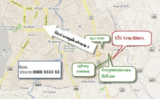 ใกล้กับ ห้าง Big C, ห้างหรู Promenada ที่จะเปิดใหม่ในปี2555นี้ ที่สวยมาก ติดถนนทั้งด้านหน้า และหลัง ถนนสมโภชเชี่ยงใหม่700ปี ต.ท่าศาลา อ.เมือง ที่รูปสี่เหลี่ยม จำนวน 5ไร่ 1งาน 92 ตารางวา ราคาตารางวาละ 25,000 บาท ( 54.8ล้านบาท )