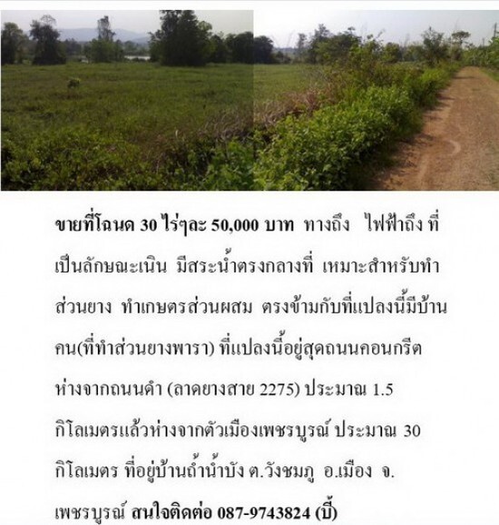 ขายที่โฉนด 30 ไร่ๆละ 50,000 บาท ทางถึง ไฟฟ้าถึง ที่เป็นลักษณะเนิน มีสระน้ำตรงกลางที่ เหมาะสำหรับทำส่วนยาง ทำเกษตรส่วนผสม ตรงข้ามกับที่แปลงนี้มีบ้านคน(ที่ทำส่วนยางพารา) ที่แปลงนี้อยู่สุดถนนคอนกรีต ห่างจากถนนดำ (ลาดยางสาย 2275) ประมาณ 1.5 กิโลเมตรแล้วห่างจากตัวเมืองเพชรบูรณ์ ประมาณ 30 กิโลเมตร ที่อยู่บ้านถ้ำน้ำบัง ต.วังชมภู อ.เมือง จ.เพชรบูรณ์ สนใจติดต่อ 087-9743824 (บี้)