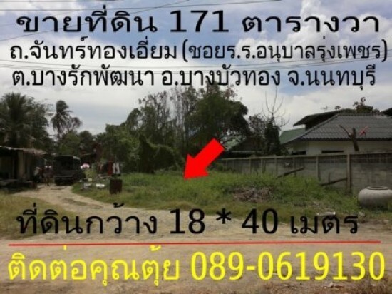 ขายที่ดิน 171 ตารางวาถนนจันทร์ทองเอี่ยม(ซ.วัดไผ่เหลืองหรือซ.โรงเรียนอนุบาลรุ่งเพชร) อ.บางบัวทอง จ.นนทบุรี ขายตรว.ละ 19,000 บาท