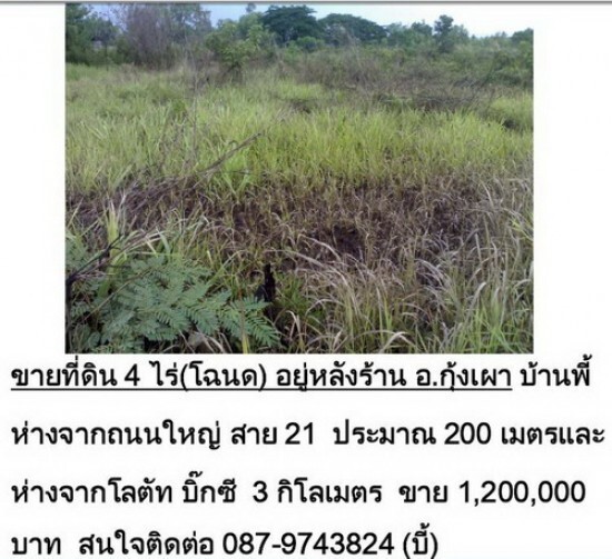 ขายที่ดิน 4 ไร่(โฉนด) อยู่หลังร้าน อ.กุ้งเผา บ้านพี้ ห่างจากถนนใหญ่ สาย 21 ประมาณ 200 เมตรและห่างจากโลตัท บิ๊กซี 3 กิโลเมตร ขาย 1,200,000 บาท สนใจติดต่อ 087-9743824 (บี้)
