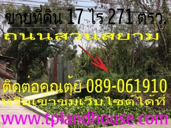 ขายที่ดินทำเลสวย 17 ไร่ 2 งาน 71 ตารางวาถ.รามอินทรกม.12 (ถนนสวนสยาม)ขายตรว.ละ 30,000 บาท ที่ดินเหมาะสำหรับทำโครงการบ้านจัดสรร การเดินทางสะดวก จากถนนรามอินทรากม.12 เพียง 750 เมตร,จากถนนเสรีไทยเพียง 1.7 กม.,ห่างจากทางด่วนกาญจนาภิเษกเพียง 2.5 กม.ใกล้ห้างสรรพสินค้าแฟชั่นไอส์แลนด์รามอินทรากม. 10,ใกล้สนามกอล์ฟปัญญาคลับ, โรงพยาบางนพรัตน์ ,ใกล้โรงเรียนนานาชาติการบินการโรงแรม,ใกล้โรงเรียนเศรษฐบุตรบำเพ็ญ,ใกล้สวนสยาม,มีรถเมล์ผ่าน ,มีร้านสะดวกซื้ออยู่หน้าปากซอยทางเข้าถนนสวนสยาม สนใจติดต่อได้ที่คุณอำนาจ 085-1946234 หรือคุณธีรภัทร(ตุ้ย) 089-0619130 หรือเข้าชมเว็บไซต์ได้ที่ http://www.tplandhouse.com ศูนย์บริการรับฝากขาย บ้าน ที่ดิน ขายฝาก ซื้อ เช่า โฆษณา รับถมที่ดิน ฟรีโฆษณา