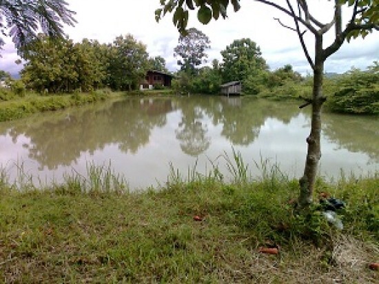 บ้านสองชั้น ไม้ ปูน หนึ่งหลัง สร้างบนที่ดิน 10 ไร่ ด้านหน้าเป็นบ่อปลา ด้านหลังทำนาได้
