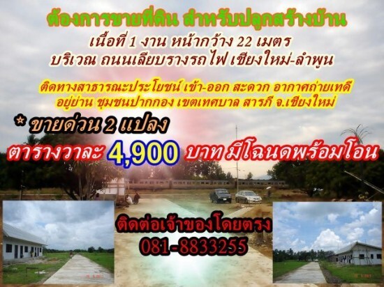 ขายที่ดิน สำหรับปลูกสร้างบ้าน เนื้อที่ 1 งาน บริเวณ ถนนเลียบรางรถไฟ เชียงใหม่-ลำพูน