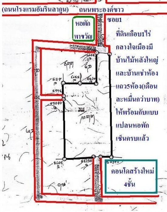 ขายด่วน ที่ดิน1ไร่กลางใจเมืองน้ำไม่ท่วมแน่นอน อีกทั้งที่ดินนี้ตั้งอยู่ในเขตเศรษฐกิจตัวเมืองชั้นในโซนA แต่ขายราคาเพียง ตรว.ละ 1.5 หมื่น ทั้งนี้ราคารวม 5.7ล้านบาท โดยราคานี้รวมบ้านไม้หลังใหญ่ยกสูง(4ห้องนอน1ห้องพระ1ห้องโถง1ห้องครัว1ระเบียงชานพักและ2ห้องน้ำบนล่าง)และบ้านเช่าห้องแถวอีก5ห้อง มีรายได้หมื่นกว่าบาททุกเดือน หากสนใจทำหอพักมีแบบแปลนให้ด้วย(ขออนุญาตเทศบาลแล้ว เซ็นผ่านครบหมดแล้ว ยื่นแบบสร้างได้เลย ...)เพราะที่ดินใกล้โรงเรียนหลายแห่งและอยู่ในย่านเศษฐกิจตัวเมืองชั้นในจึงเหมาะทำบ้านเช่าหรือหอพักอย่างยิ่ง....สามารถเข้าออกได้2ทาง ด้านหน้าออกทางถนนพระองค์ขาว(เส้นเดียวกับโรงแรมอัมรินลากูน ระดับ5ดาว)ด้านหลังออกไปทางวัดอรัญญิก(ด้านหลังติดกับที่ดินของเราและถนนดังกล่าวกำลังมีคอนโดสร้างใหม่อยู่ครับ)