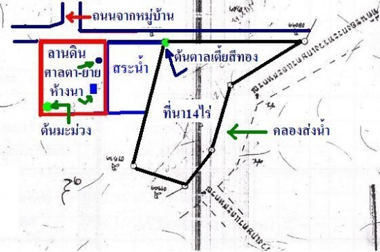 (ทางเข้าที่นาเป็นถนนคอนกรีตซอยแรกด้านซ้ายมือเป็นทางเข้าหมู่บ้านคลองเมม เมื่อเลี้ยวเข้ามาสู่ทางเข้าเขื่อนแล้วเพียง30-50เมตร ก็จะเห็นร้านค้าเรียงราย ถัดมาเล็กน้อยจะเห็นทางเข้าหมู่บ้าน) โดยที่นาอยู่หลังหมู่บ้านดังกล่าว....โดยขับรถไปตามถนนคอนกรีตตรงไปไม่ต้องเลี้ยวตามซอยย่อยนะครับตรงไปจนซอยสุดท้ายตรงทางโค้งจะมีทางแยกเข้าสู่ ถนนลูกรังไปเข้าที่นา โดยตรงไปตามทางเพียง2โค้ง จะพบลานดินพื้นที่ประมาณ1งาน ตรงเข้าไปเลยครับ(อยู่ตรงทางโค้งพอดีมีเพียงที่เดียวในบริเวณนั้น ให้สังเกตุมีศาลตา-ยายหลังคาสีฟ้า อยู่ข้างๆห้างนาและมีต้นมะม่วงใหญ่ตรงมุมที่ดินนี้) โดยเป็นที่จอดรถ เป็นที่เอารถเกี่ยวข้าวลง เป็นลานสีข้าว ของชาวนาที่นั้นใช้ร่วมกันมาหลายสิบปีครับ ถัดจากลานดินดังกล่าวจะเป็นสระน้ำขนาดพอเหมาะ(เป็นที่พักน้ำและที่หาปลาบ้างอะไรบ้าง ร่วมกันของชาวนาที่นั้นเหมือนลานดิน) ถัดจากสระน้ำนั้น(จากต้นตาลเตี้ยสีทองตรงขอบสระ)ตรงยาวไปจนถึงแนวคลองใหญ่และย้อนขึ้นมาจากแนวคลองใหญ่ตลอดแนวคลองนั้น จนถึงขอบที่นาที่ปลูกต้นไม้เรียงรายอยู่ วกกลับมาจนถึงขอบสระพักน้ำดังกล่าวตรงต้นตาลเตี้ยสีทอง โดยมีพื้นที่จริงรวมประมาณ 14 ไร่ครับ ...