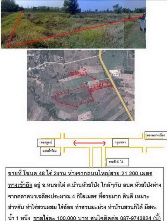 ขายที่ โฉนด 48 ไร่ 2งาน ห่างจากถนนใหญ่สาย 21 200 เมตร ทางเข้าถึง อยู่ อ.หนองไผ่ ต.บ้านห้วยโป่ง ใกล้ๆกับ อบต.ห้วยโป่งห่างจากตลาดนาเฉลียงประมาณ 4 กิโลเมตร ที่สวยมาก ดินดี เหมาะสำหรับ ทำไร่สวนผสม ไร่อ้อย ทำสวนมะม่วง ทำบ้านสวนก็ได้ มีสระน้ำ 1 หนึ่ง ขายไร่ละ 100,000 บาท สนใจติดต่อ 087-9743824 (บี้)