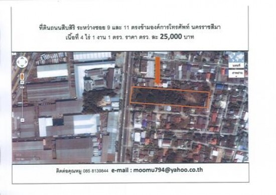 ขายที่ดิน 4 ไร่ 1 งาน 1 ตรว ถนนสืบศิริ ระหว่างซอย 7-9 ตรงข้ามองค์การโทรศัพท์ จ, นครราชสีมา ราคาตรว. ละ 25000 ติดต่อ คุณหมู 085 8139844 e-mail : [email protected]