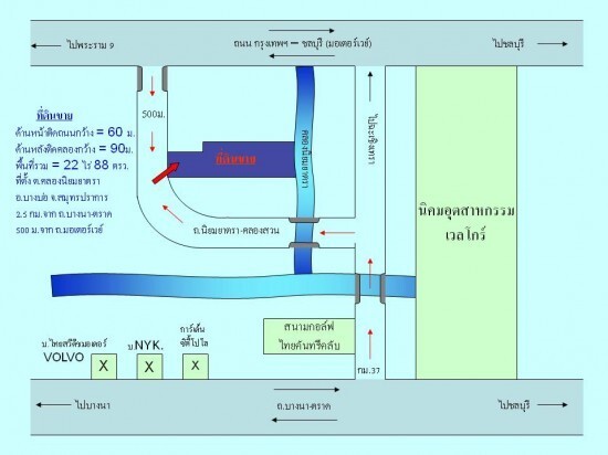 ด้านหน้าติดถนนกว้าง = 60 เมตร ด้านหลังติดคลองกว้าง = 90 เมตร