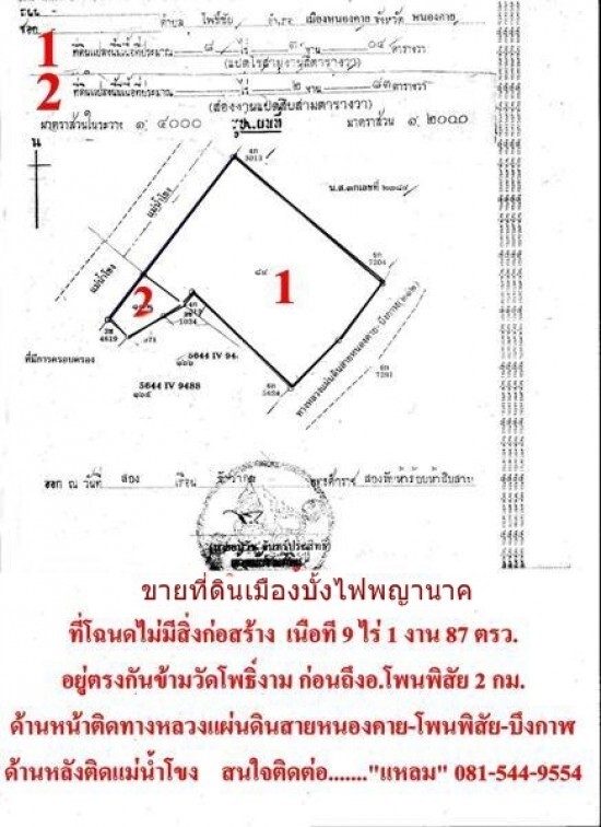 ขายที่ดินเปล่า 9-1-87 ไร่ ด้านหน้าติดถนน 4 เลนหนองคาย-โพนพิสัย-บึงกาฬ ด้านหลังติดแม่น้ำโขง.