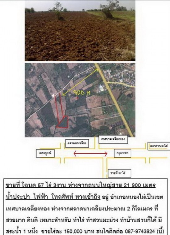 ขายที่ โฉนด 57 ไร่ 3งาน ห่างจากถนนใหญ่สาย 21 900 เมตร น้ำประปา ไฟฟ้า โทรศัพท์ ทางเข้าถึง อยู่ อำเภอหนองไผ่เป็นเขตเทศบา
