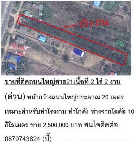 ขายที่ติดถนนใหญ่สาย21เนื้อที่ 2 ไร่ 2 งาน(ด่วน) หน้ากว้างถนนใหญ่ประมาณ 20 เมตร เหมาะสำหรับทำโรงงาน ทำโกดัง ห่างจากโลตัส 10 กิโลเมตร ขาย 2,500,000 บาท สนใจติดต่อ 0879743824 (บี้)