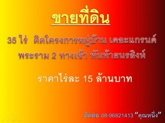 ขายที่ดิน 35 ไร่ ติดโครงการหมู่บ้าน เดอะแกรนด์ พระราม 2 ทางเข้า พันท้ายนรสิงห์ ราคาไร่ละ 15 ล้านบาท ติดต่อ 08-96821413 “คุณหนึ่ง”