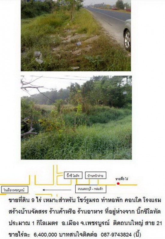 ขายที่ดิน 9 ไร่ ติดถนนใหญสาย 21 เหมาะสำหรับ โชว์รูมรถ ทำหอพัก คอนโด โรงแรม สร้างบ้านจัดสรร ร้านค้าหรือ ร้านอาหาร ที่อยู่ห่างจาก บิ๊กซีโลทัต ประมาณ 1 กิโลเมตร อ.เมือง จ.เพชรบูรณ์ ติดถนนใหญ่ สาย 21 ขายไร่ละ 6,400,000 บาทสนใจติดต่อ 087-9743824 (บี้)