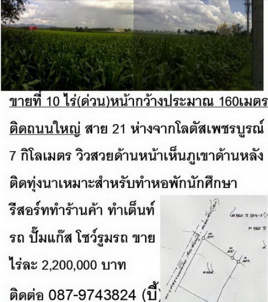 ขายที่ 10 ไร่(ด่วน)หน้ากว้างประมาณ 160เมตร ติดถนนใหญ่ สาย 21 ห่างจากโลตัสเพชรบูรณ์ 7 กิโลเมตร วิวสวยด้านหน้าเห็นภูเขาด้านหลังติดทุ่งนาเหมาะสำหรับทำหอพักนักศึกษา รีสอร์ททำร้านค้า ทำเต็นท์ รถ ปั๊มแก๊ส โชว์รูมรถ ขาย ไร่ละ 2,300,000 บาท สนใจติดต่อ 087-9743824 (บี้