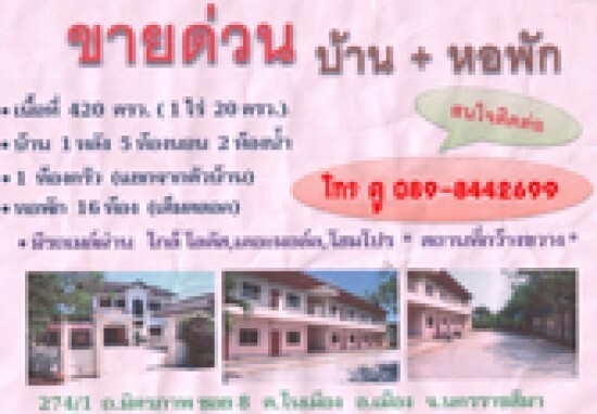 ต้องการขายหอพัก และบ้านเลขที่ 274/1 ถ.มิตรภาพ ซอย8 ต.ในเมือง อ.เมือง จ.นครราชสีมา เนื้อที่ 420 ตรว.(1ไร่20ตรว.)