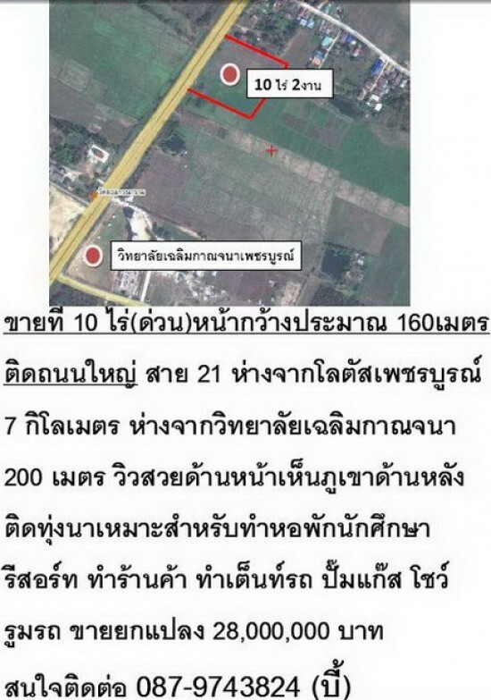 ขายที่ 10 ไร่(ด่วน)หน้ากว้างประมาณ 160เมตร ติดถนนใหญ่ สาย 21 ห่างจากโลตัสเพชรบูรณ์ 7 กิโลเมตร ห่างจากวิทยาลัยเฉลิมกาณจนา 200 เมตร วิวสวยด้านหน้าเห็นภูเขาด้านหลังติดทุ่งนาเหมาะสำหรับทำหอพักนักศึกษา รีสอร์ท ทำร้านค้า ทำเต็นท์รถ ปั๊มแก๊ส โชว์ รูมรถ ขายยกแปลง 28,000,000 บาท สนใจติดต่อ 087-9743824 (บี้)