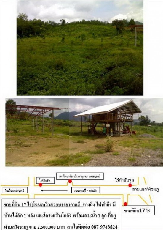 ขายที่ดิน 17 ไร่(โฉนด)วิวสวยบรรยากาศดี ทางถึง ไฟฟ้าถึง มีบ้านไม้สัก 1 หลัง และโครงสร้างโกดัง พร้อมสระน้ำ 1 ลูก ที่อยูตำบลวังชมภู ขาย 2,500,000 บาทสนใจติดต่อ 087-9743824 (บี้)