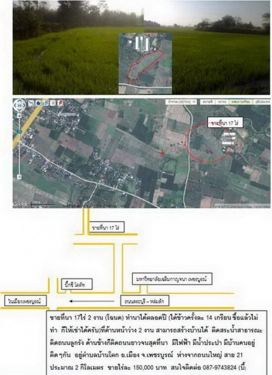 ขายที่นา 17ไร่ 73 ตรว (โฉนด) ทำนาได้ตลอดปี (ได้ข้าวครั้งละ 14 เกรียน ซื้อแล้วไม่ทำ ก็ให้เช่าได้ครับ) ที่ด้านหน้าว่าง 2 งาน สามารถสร้างบ้านได้ ติดสระน้ำสาธารณะ ติดถนนลูกรัง ด้านข้างก็ติดถนนยาวจนสุดที่นา มีไฟฟ้า มีน้ำประปา มีบ้านคนอยู่ติดๆกัน อยู่ตำบลบ้านโตก อ.เมือง จ.เพชรบูรณ์ ห่างจากถนนใหญ่ สาย 21 ประมาณ 2 กิโลเมตร ขายไร่ละ 150,000 บาท สนใจติดต่อ 087-9743824 (บี้)