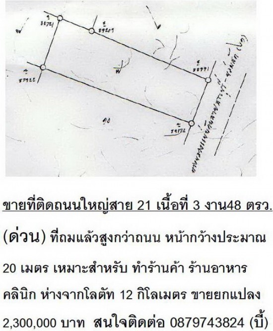 ขายที่ติดถนนใหญ่สาย 21 เนื้อที่ 3 งาน48 ตรว.(ด่วน) ที่ถมแล้วสูงกว่าถนน หน้ากว้างประมาณ 20 เมตร เหมาะสำหรับ ทำร้านค้า ร้านอาหาร คลินิก ห่างจากโลตัท 12 กิโลเมตร ขายยกแปลง 2,300,000 บาท สนใจติดต่อ 0879743824 (บี้)