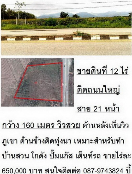 ขายดินที่ 12 ไร่ ติดถนนใหญ่ สาย 21 หน้ากว้าง 160 เมตร วิวสวย ด้านหลังเห็นวิวภูเขา ด้านข้างติดทุ่งนา เหมาะสำหรับทำบ้านสวน โกดัง ปั๊มแก๊ส เต็นท์รถ ขายไร่ละ 650,000 บาท สนใจติดต่อ 087-9743824 บี้