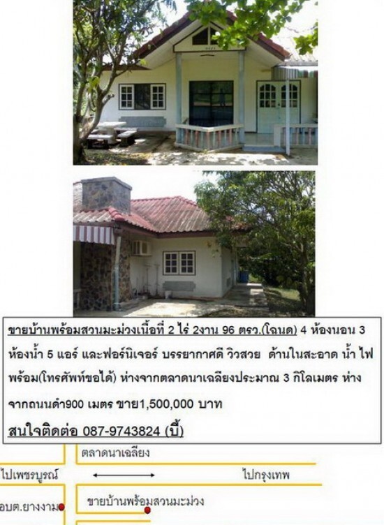 ขายบ้านพร้อมสวนมะม่วงเนื้อที่ 2 ไร่ 2งาน 96 ตรว.(โฉนด) 4 ห้องนอน 3 ห้องน้ำ 5 แอร์ และฟอร์นิเจอร์ บรรยากาศดี วิวสวย ด้านในสะอาด น้ำ ไฟ พร้อม(โทรศัพท์ขอได้) ห่างจากตลาดนาเฉลียงประมาณ 3 กิโลเมตร ห่างจากถนนดำ900 เมตร ขาย1,500,000 บาท สนใจติดต่อ 087-9743824 (บี้)