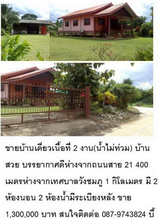 ขายบ้านเดี่ยวเนื้อที่ 2 งาน(น้ำไม่ท่วม) บ้านสวย บรรยากาศดีห่างจากถนนสาย 21 400 เมตรห่างจากเทศบาลวังชมภู 1 กิโลเมตร มี 2 ห้องนอน 2 ห้องน้ำมีระเบียงหลัง ขาย1,200,000 บาท สนใจติดต่อ 087-9743824 บี้