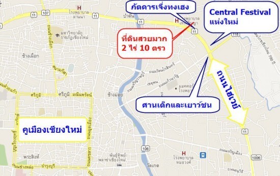 ใกล้ห้างเซ็นทรัลเชี่ยงใหม่ ทื่กำลังก่อสร้างแล้วเสร็จปลายปี2555นี้ อยู่หลังภัตตาคาร เจี่ยงซงเฮง ( ภัตตาคารใหญ่ที่สุดในเชี่ยงใหม่ ) อ.เมืองเชี่ยงใหม่ ที่รูปสี่เหลี่ยม จำนวน 2ไร่ 9 ตารางวา