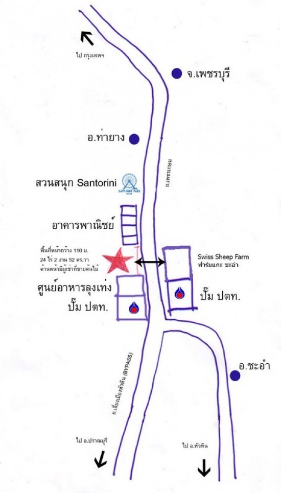ที่ดินเปล่าทำเลสวยมาก พื้นที่ประมาณ 25 ไร่ ต้องการขาย 60 ลบ. อยู่ติดกับปั้มลุงเท่งและสวนอาหารฝั่งตะวันตก ติดถนนเพชรเกษม หน้ากว้าง 110 เมตร มีเพิงขายต้นไม้อยู่ด้านหน้า ใกล้ Santorini ประมาณ 2 กม. ด้านตรงข้ามมีฟาร์มแกะชะอำ (สถานที่ท่องเที่ยวใหม่) และโครงการจะทำสวนเสือในอนาคต