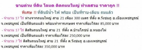 - จำนวน 17 ไร่ ห่างจากถนนใหญ่ สาย 21 เพียง 300 เมตร ที่ตั้ง ต.วังชมภู อ.เมืองเพชรบูรณ์ จ.เพชรบูรณ์ เป็นที่ดินถมแล้ว พร้อมทำการเกษตร ราคาเพียงไร่ละ 85,000 บาท