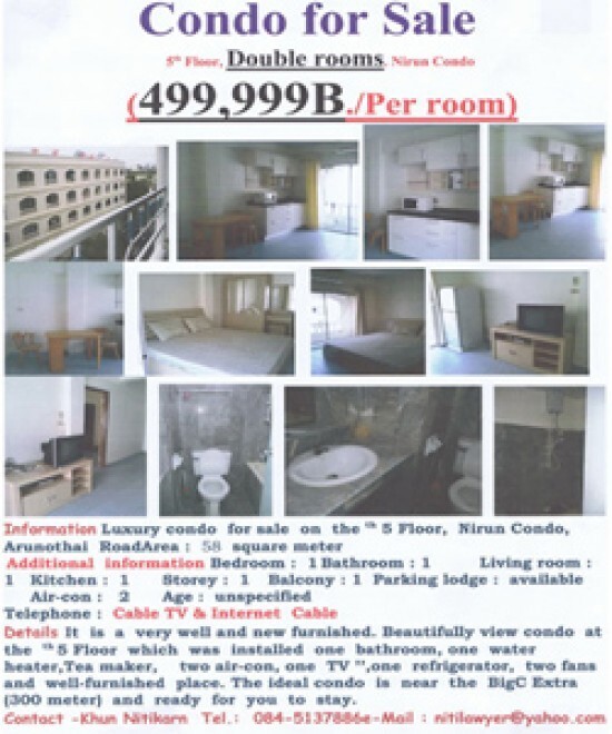 Luxury condo for sale on the th 5 Floor, Nirun Condo, Arunothai RoadArea : 58 square meter