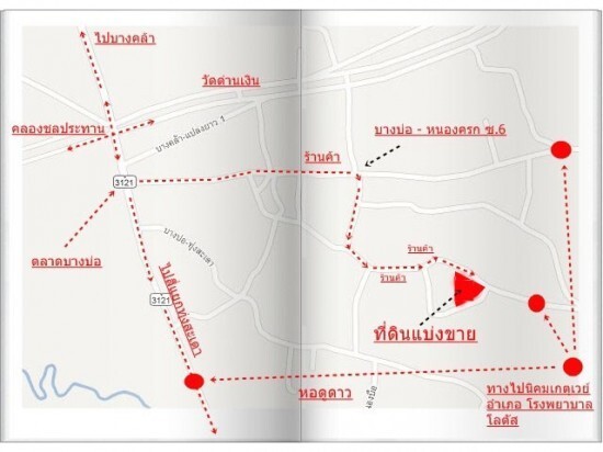 ที่ติดถนน ที่ไม่ใช่สามเหลี่ยม เข้าทางตลาดบางบ่อ ใกล้ชุมชน